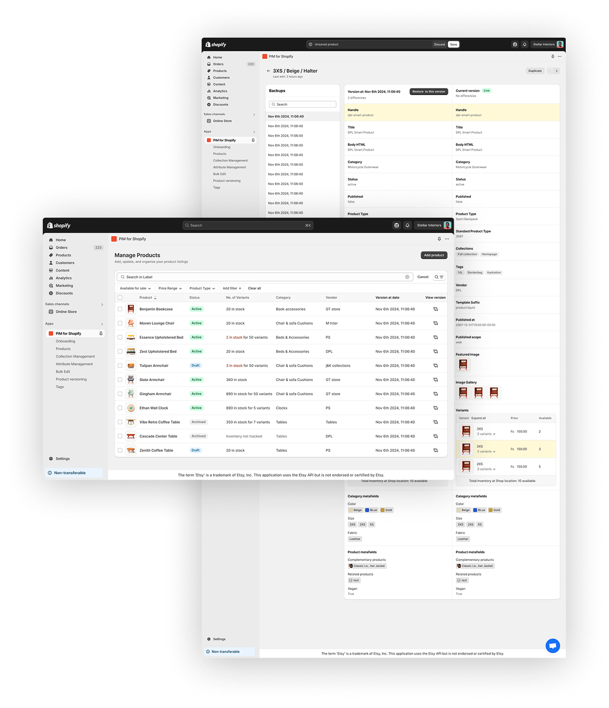 Built to eliminate the pain of spreadsheets, broken syncs, and half-integrated external tools. MerchPIM lives inside Shopify, which is built on its product taxonomy, using Polaris and syncing through Storefront API.